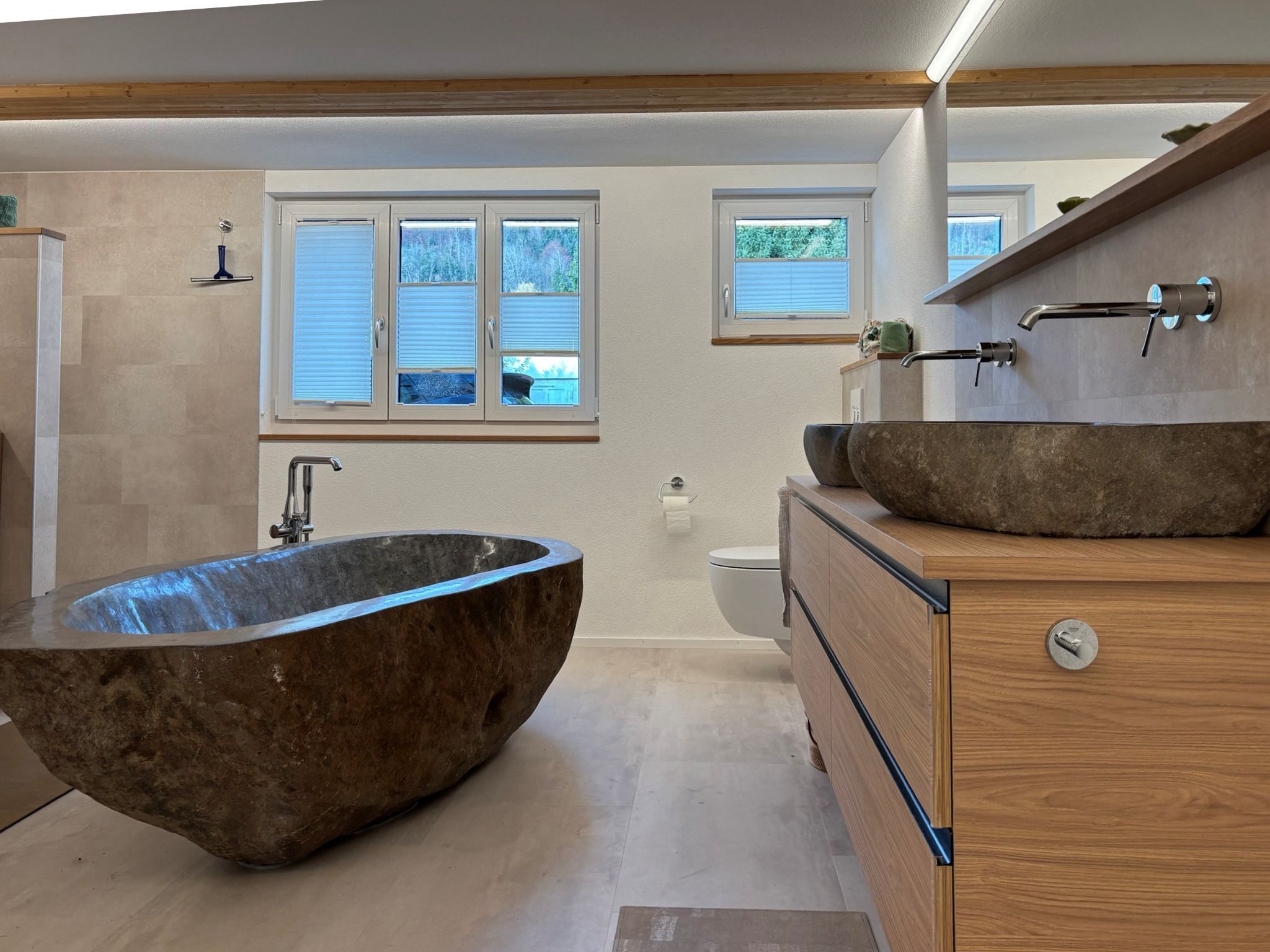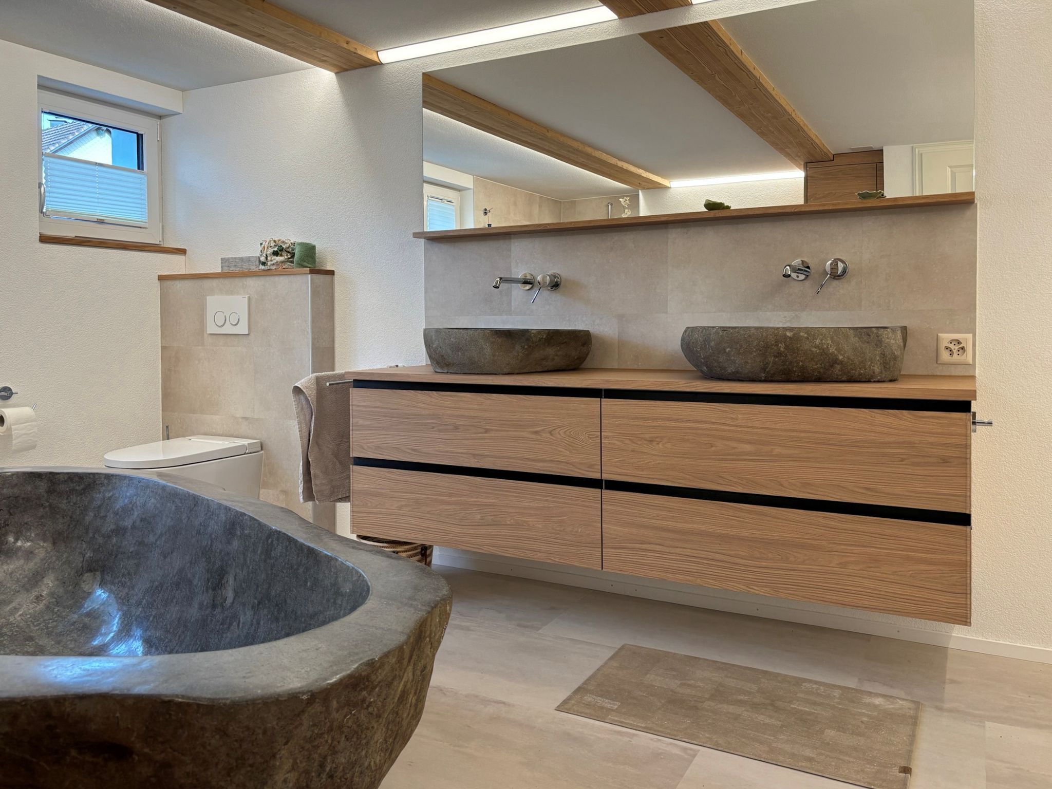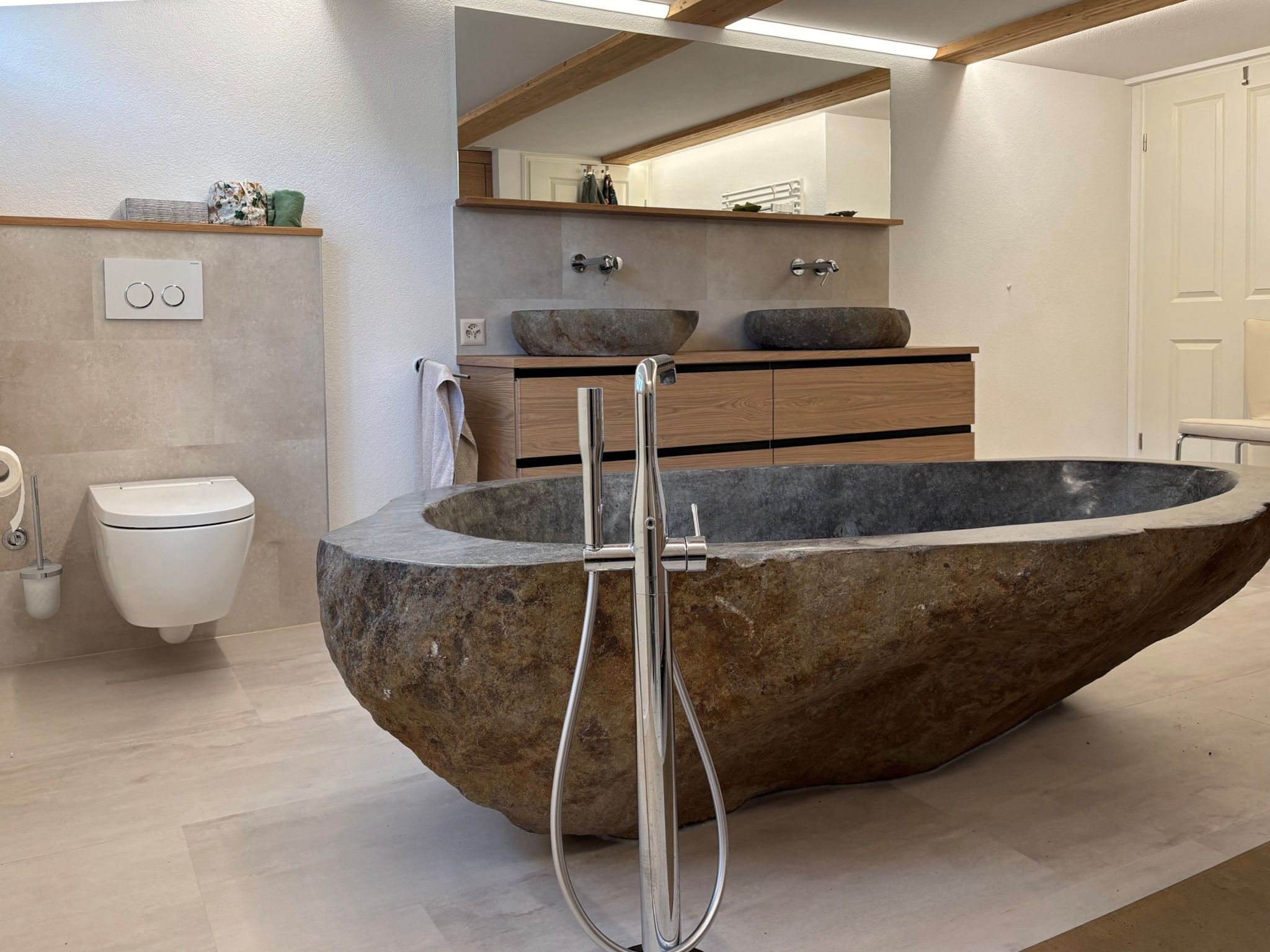 Dieser Badumbau mit einer Badewanne aus Naturstein als Highlight durften wir planen und umsetzen.