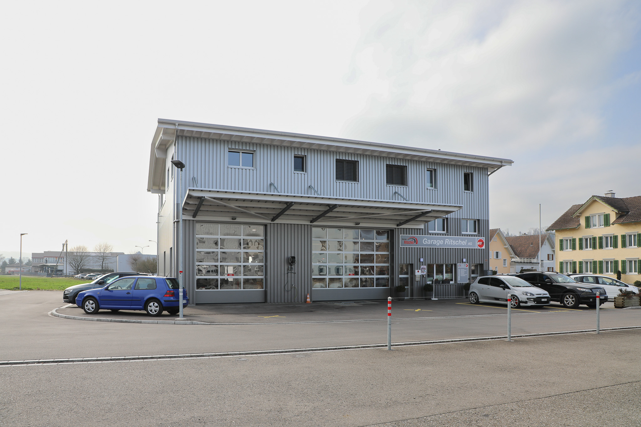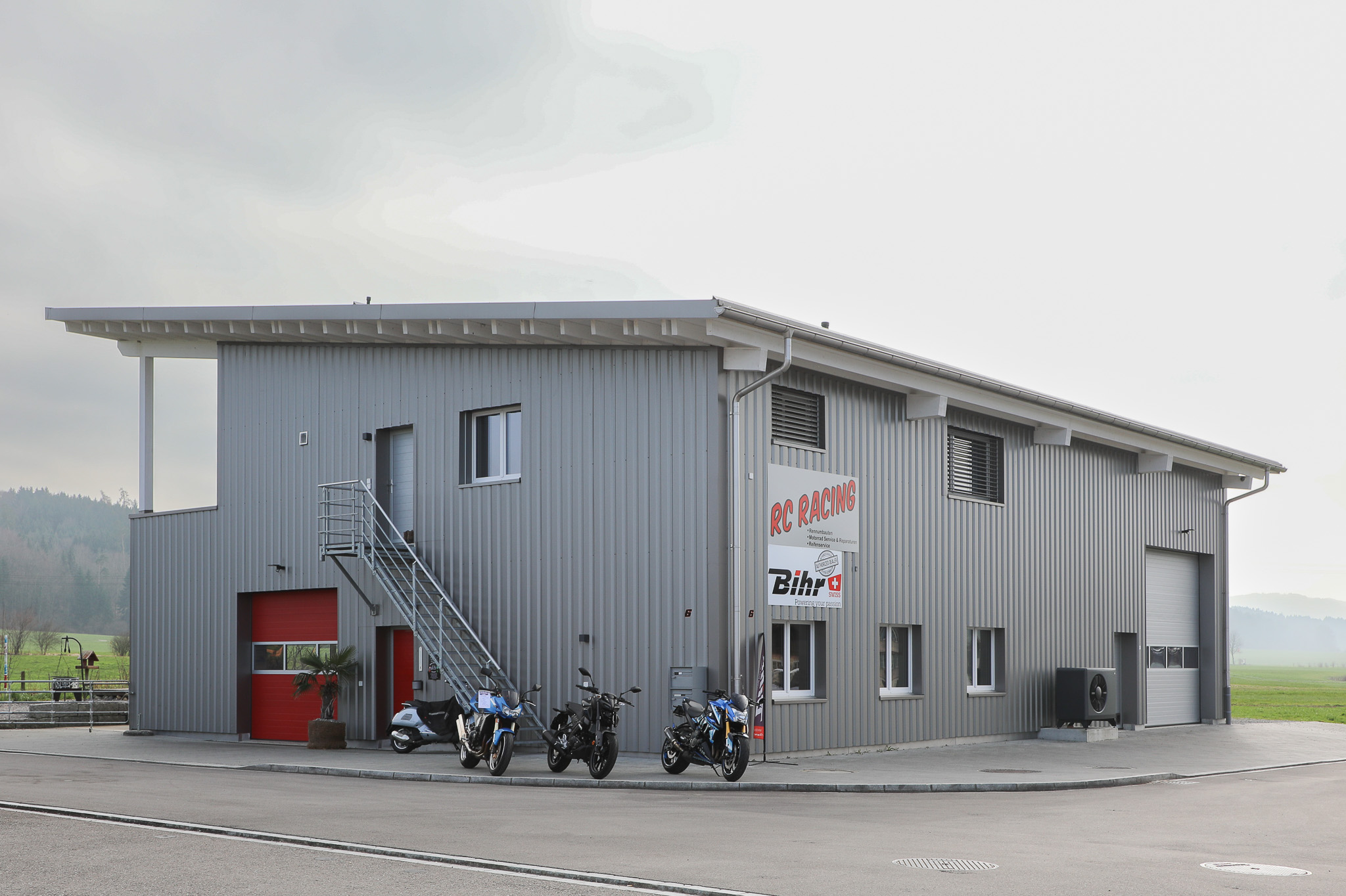 Auto- und Motorradwerkstatt mit BetriebsleiterwohnungEine Holzkonstruktion mit Wellblechfassade
