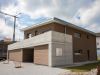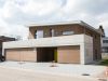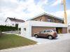 Modernes Holzhaus mit Pultdach, gestaltet mit horizontaler Rhomboidschalung in Kombination mit markanten Elementen aus Sichtbeton.